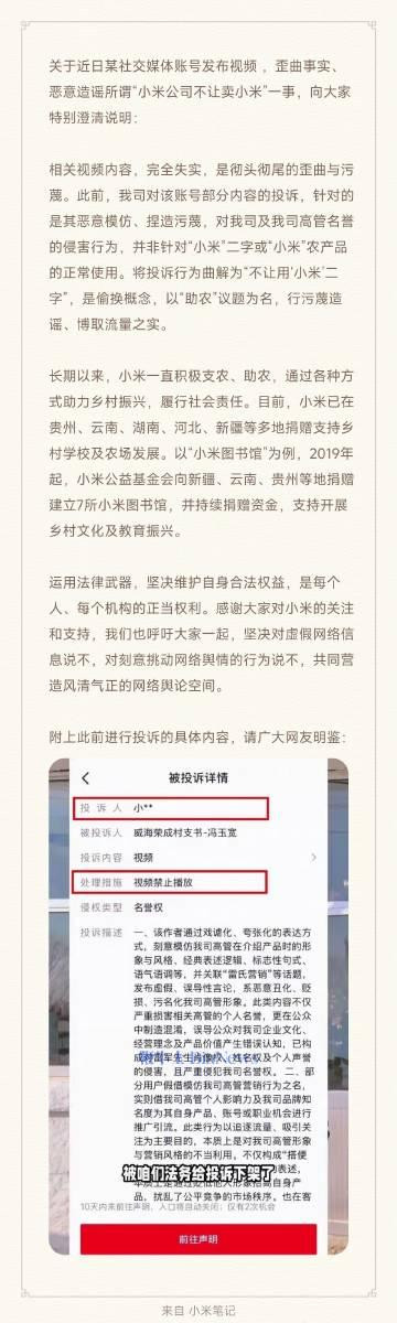 此前,小米公司对该账号部分内容的投诉,针对的是其恶意模仿、捏造污蔑,对我司及我司高管名誉的侵害行为,并非针对“小米”二字或“小米”农产品的正常使用。将投诉行为曲解为“不让用‘小米’二字”,是偷换概念,以“助农”议题为名,行污蔑造谣、博取流量之实。